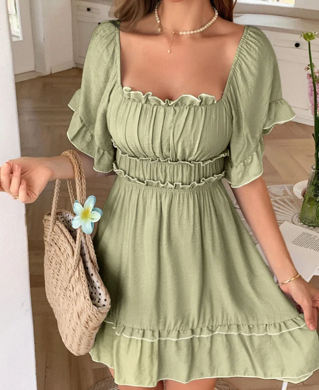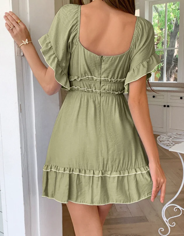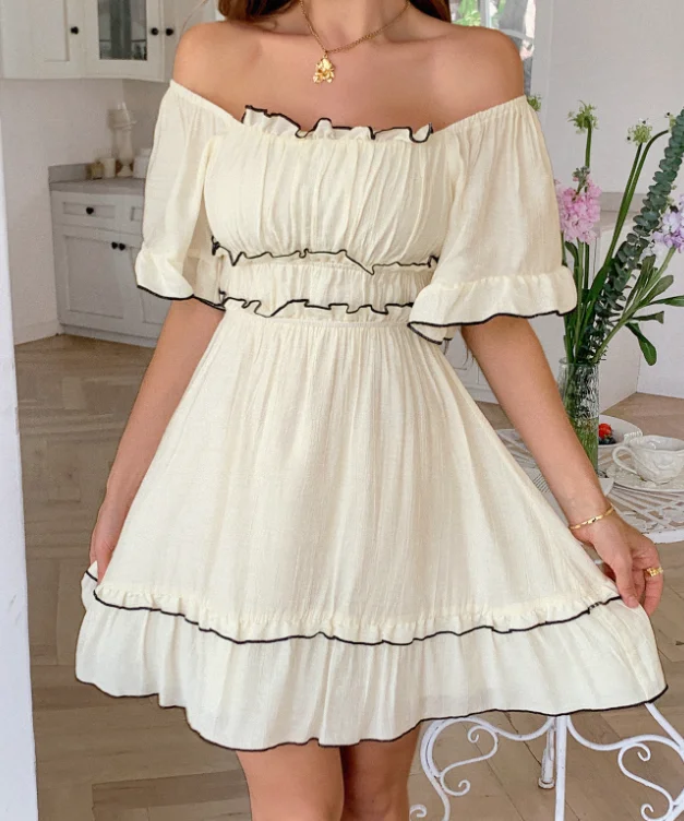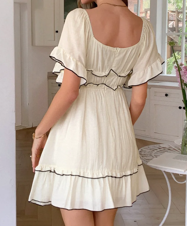 Vestido de peito envolto com atmosfera à beira-mar estilo lazer de férias, design moderno de emenda de borda contrastante, vestido evasê