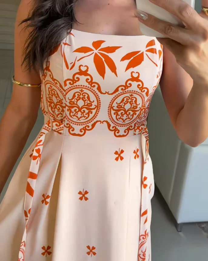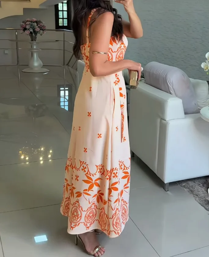 2025 Vestidos femininos estampa floral pescoço quadrado sem mangas vestido evasê casual cintura franzida amarrada detalhe maxi vestido com bolsos